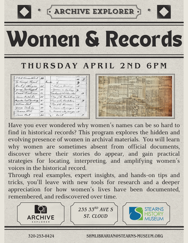 Join the Stearns History Museum for this engaging Archive Explorer program exploring the hidden and evolving presence of women in archival materials. Participants will learn why women are sometimes absent from official documents, discover where their stories do appear, and gain practical strategies for locating and interpreting women?s voices in the historical record.